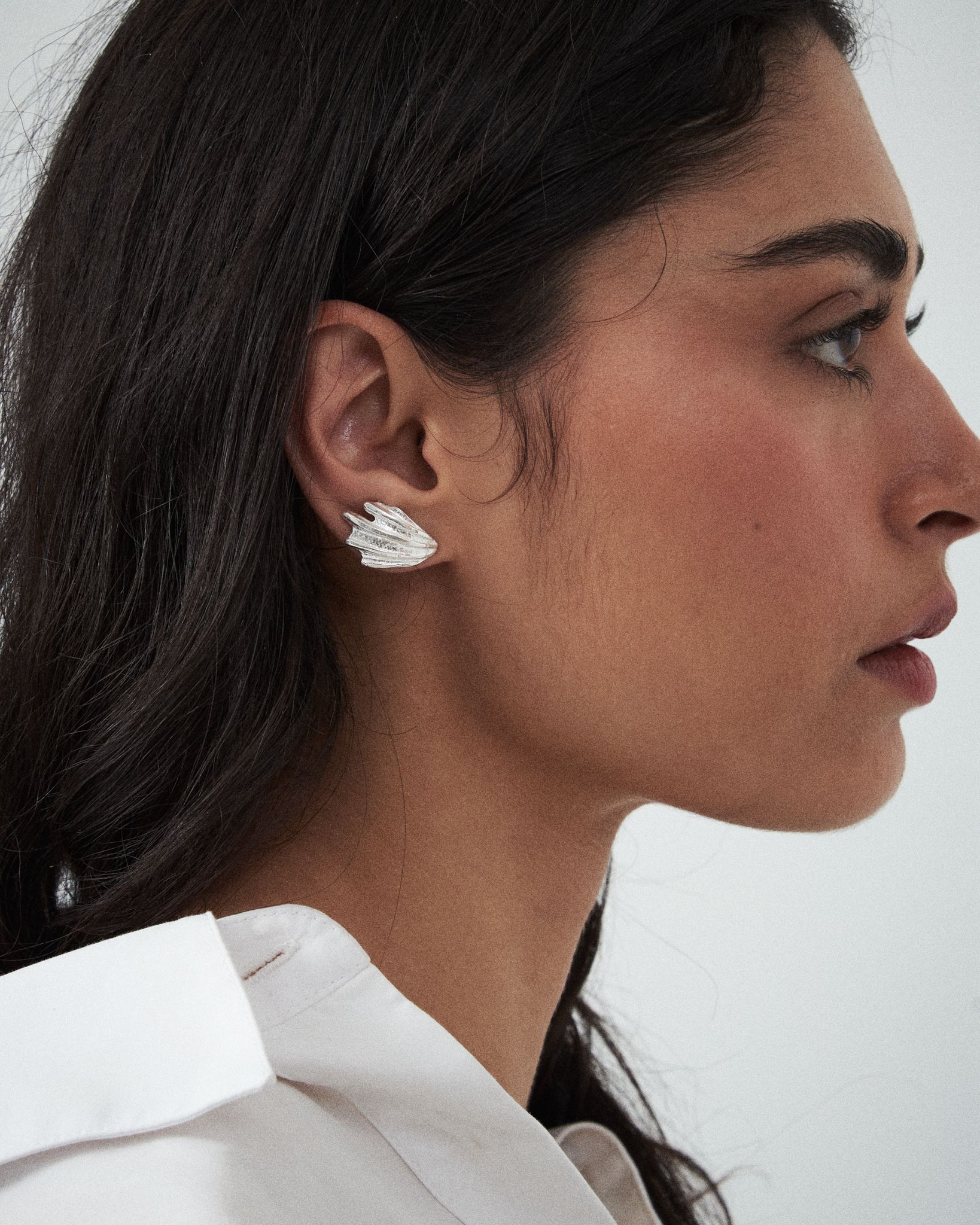 Formed from a real scallop shell, sand cast in solid recycled sterling silver, this sculptural earring traces the ocean’s natural geometry. Its soft curve follows the ear’s contour, catching light with every turn and echoing the movement of waves.