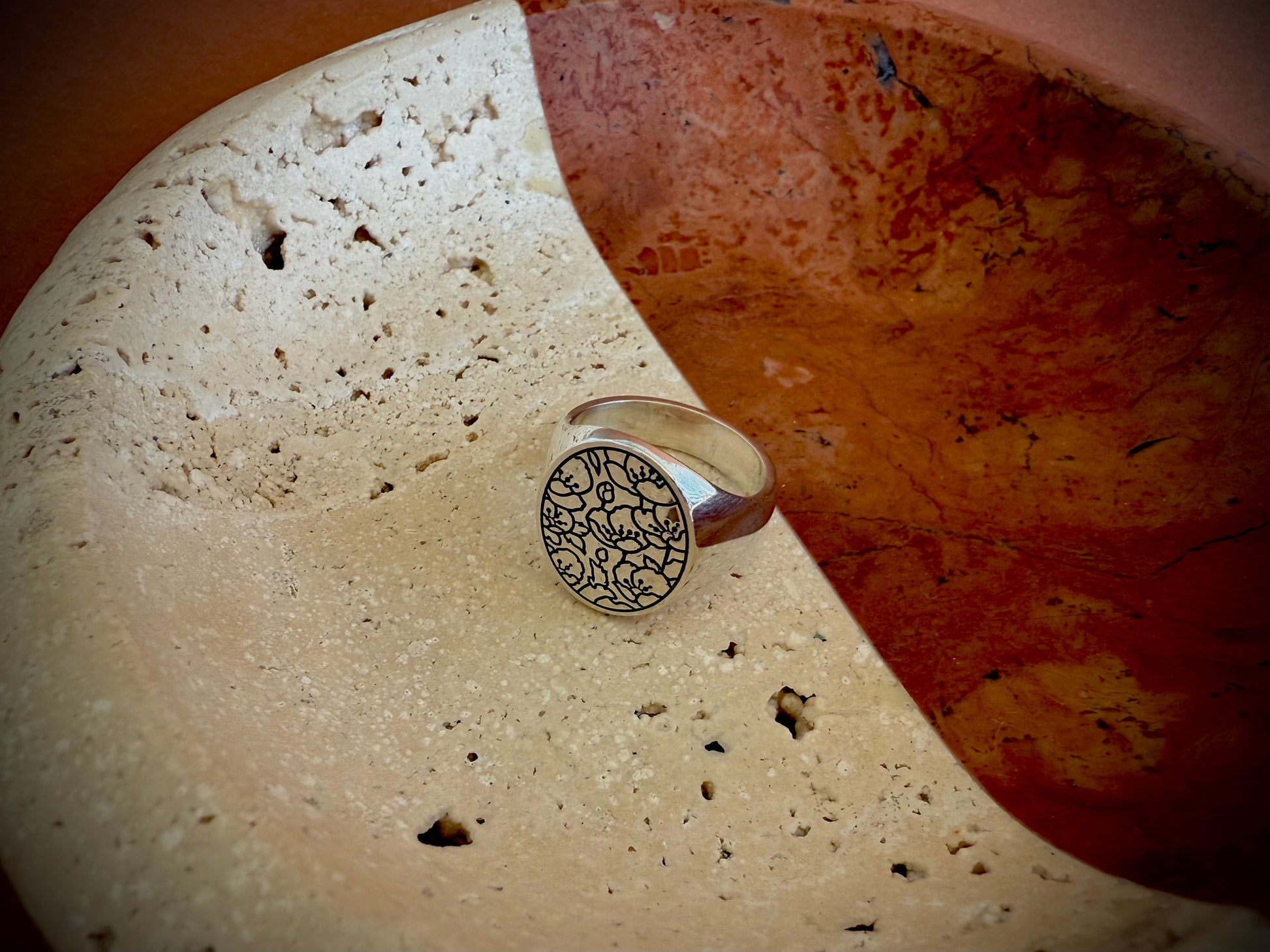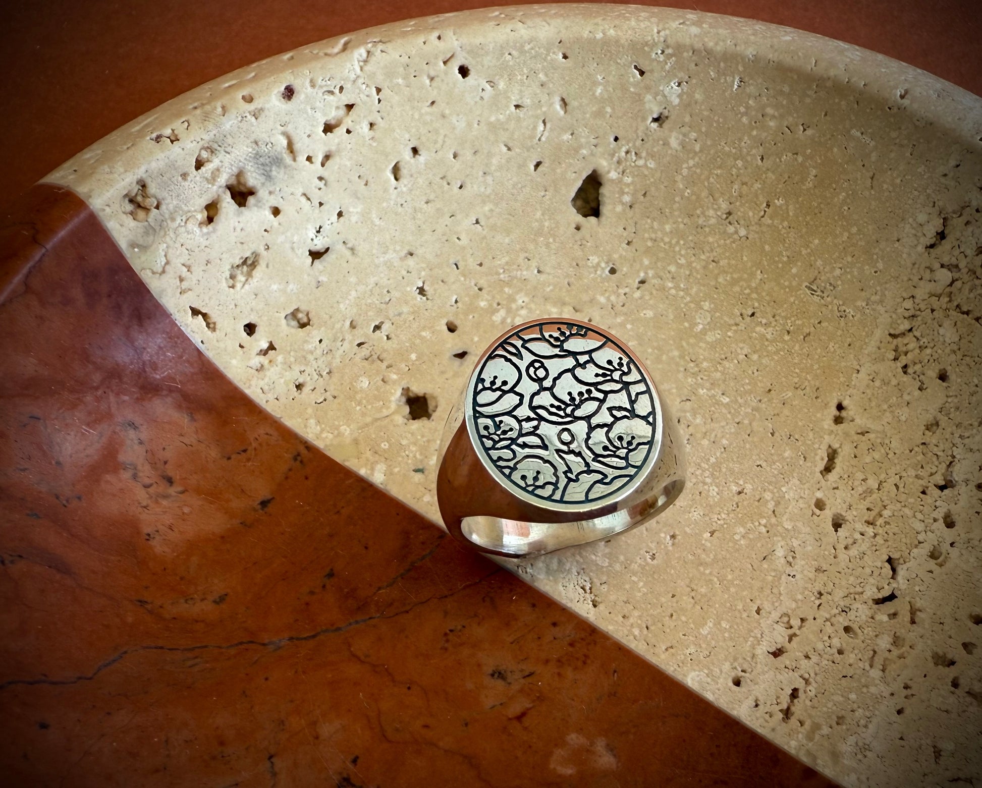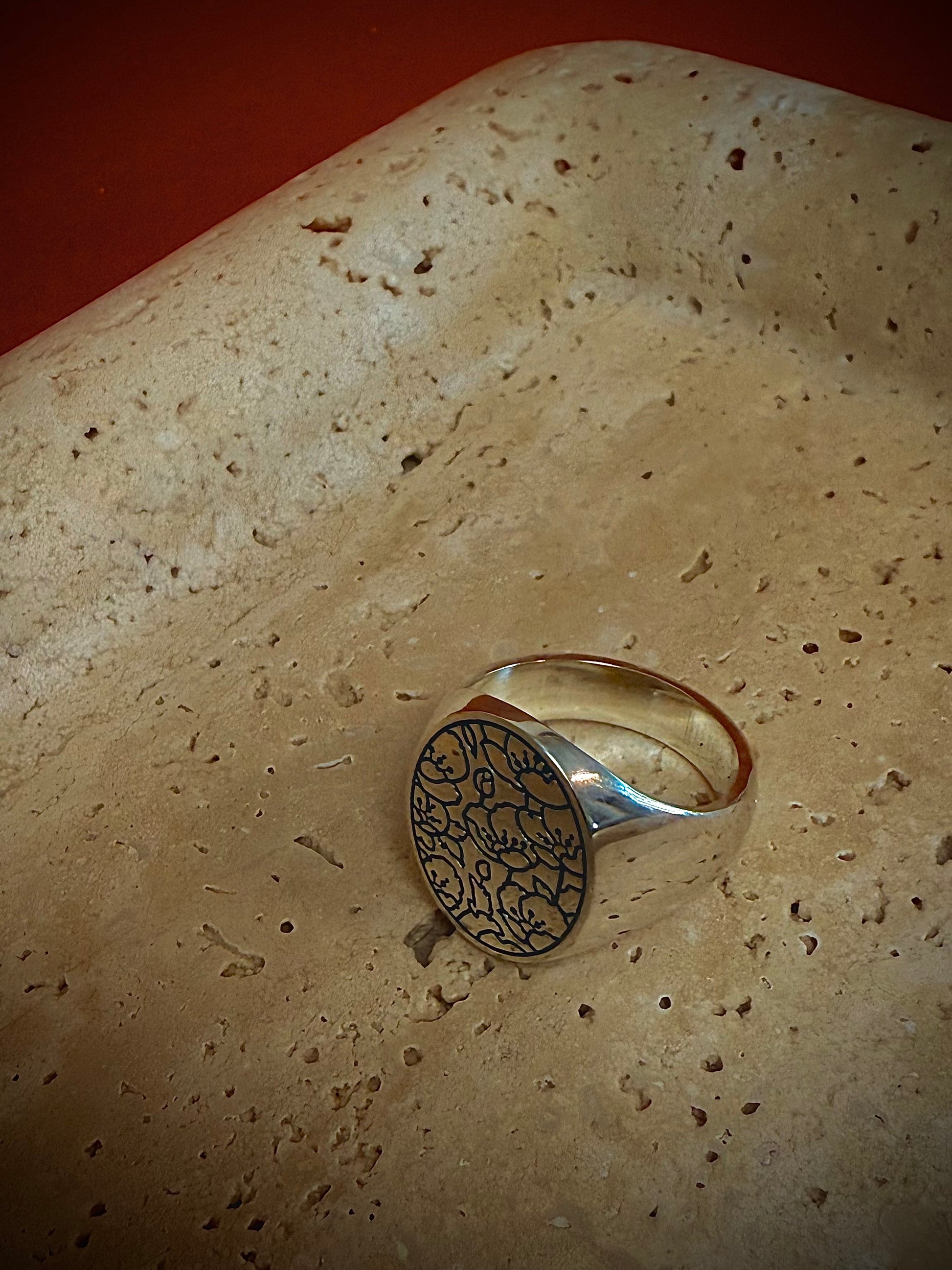 A signet ring with a floral print, symbolising growth, radiance, and the idea of thriving in one's current circumstances. The delicate, intricate nature of the floral design adds a touch of splendour and refinement to the ring.