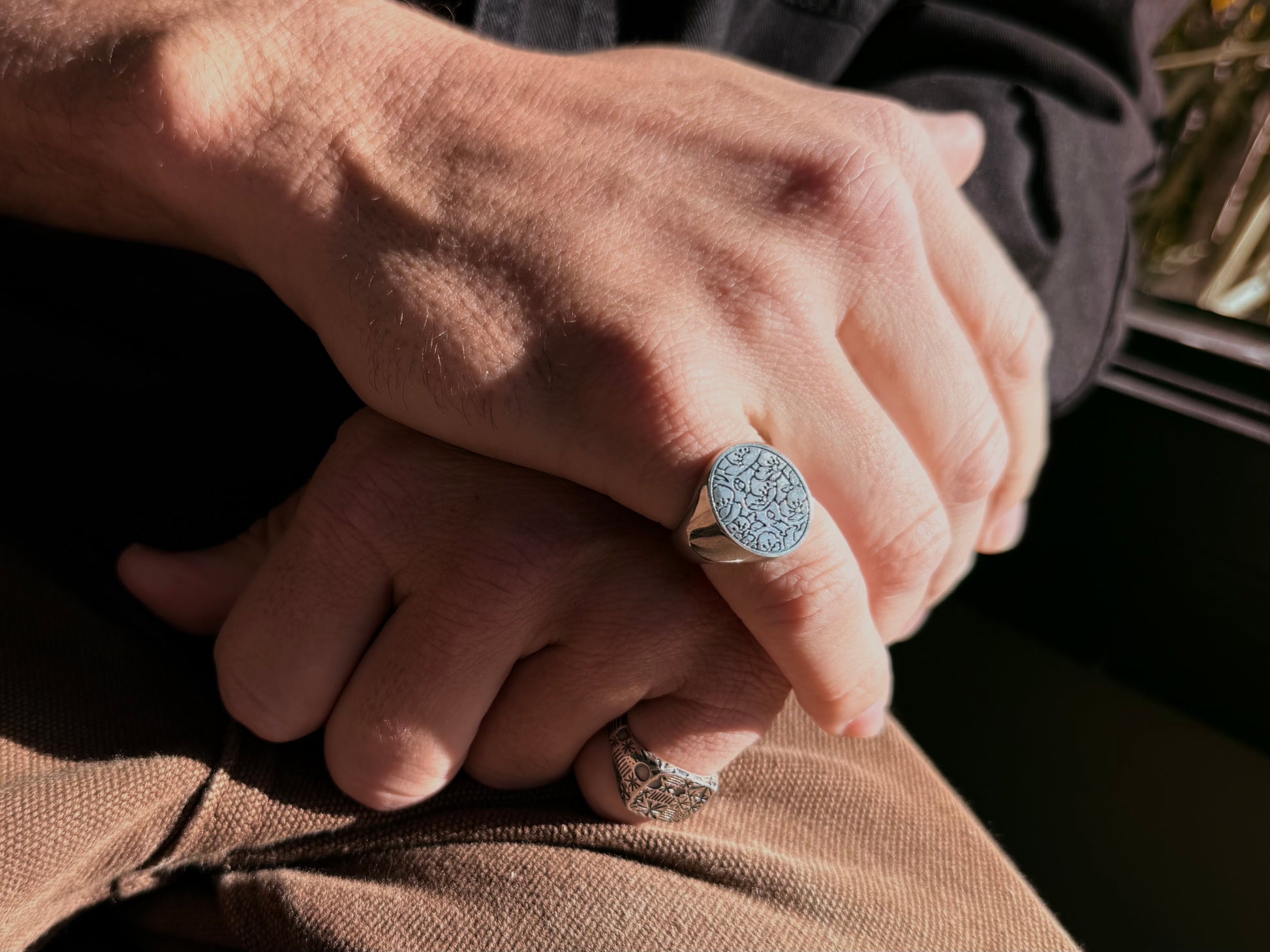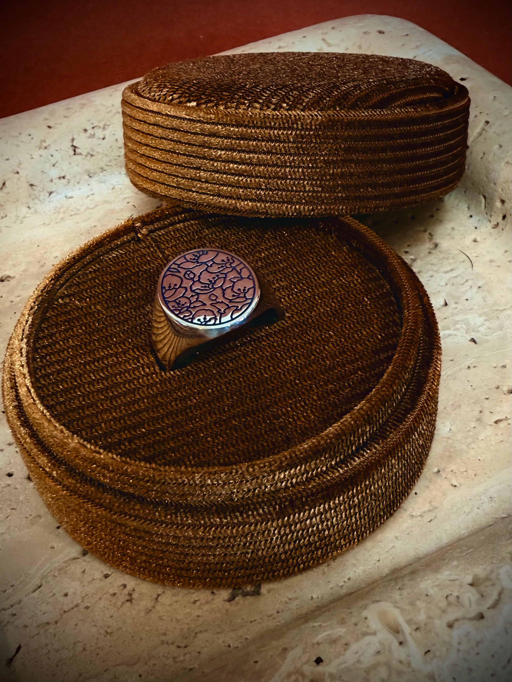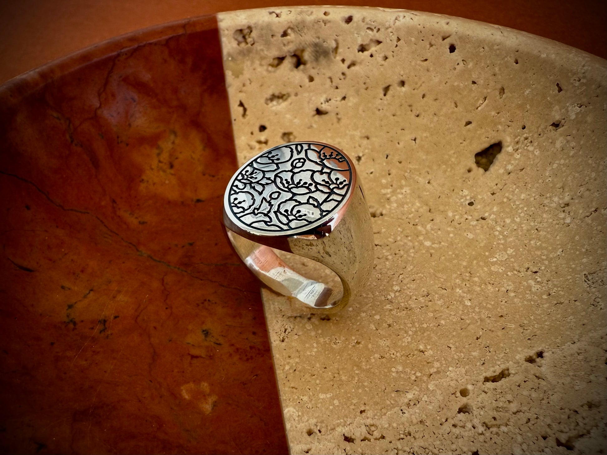 A signet ring with a floral print, symbolising growth, radiance, and the idea of thriving in one's current circumstances. The delicate, intricate nature of the floral design adds a touch of splendour and refinement to the ring.