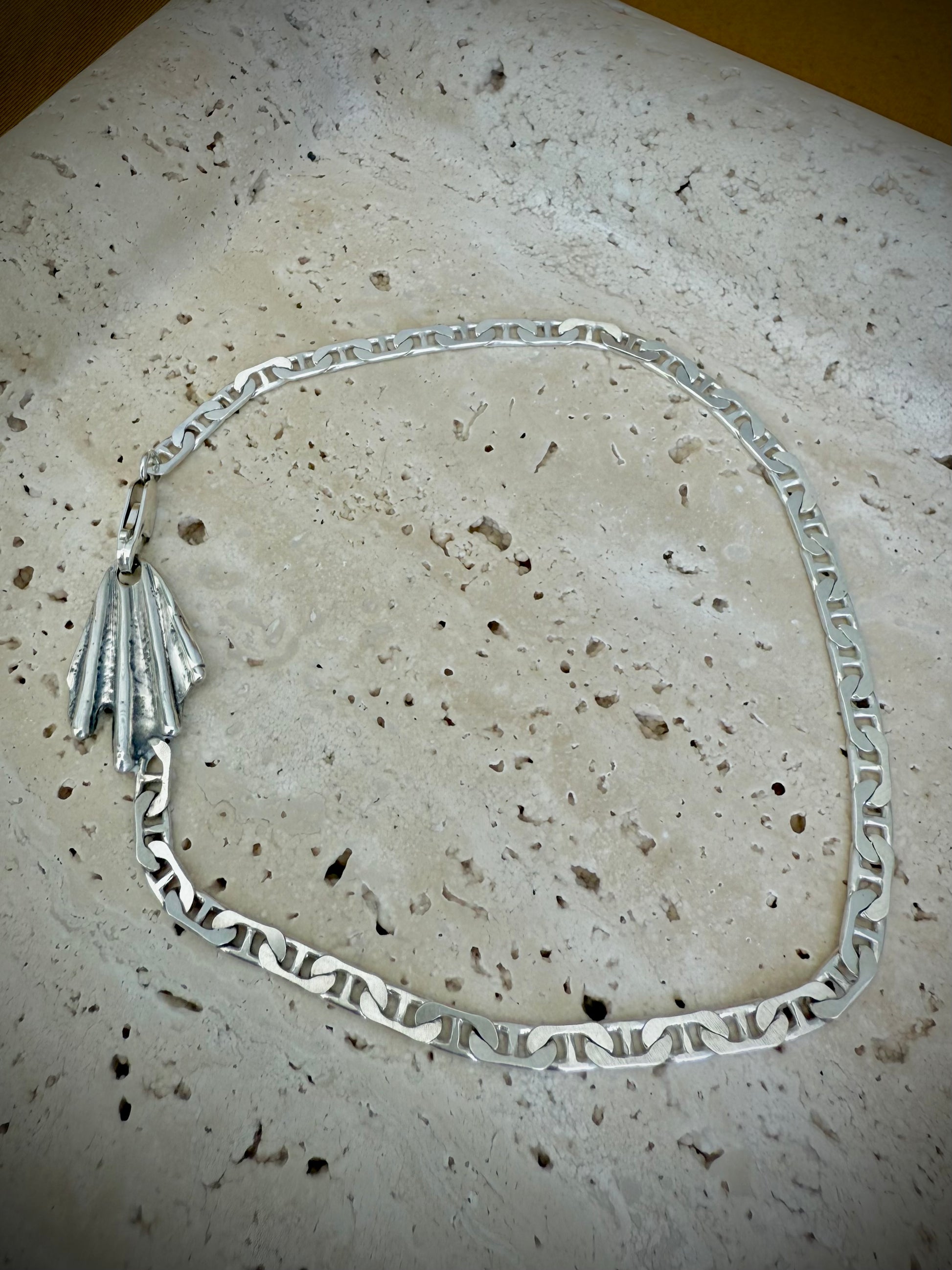 It fastens seamlessly into a fine marine chain, echoing the rhythm of the ocean with its soft, fluid links. Wear it as a reminder of sunlit tides and slow coastal days — barefoot, golden, and grounded by the sea.